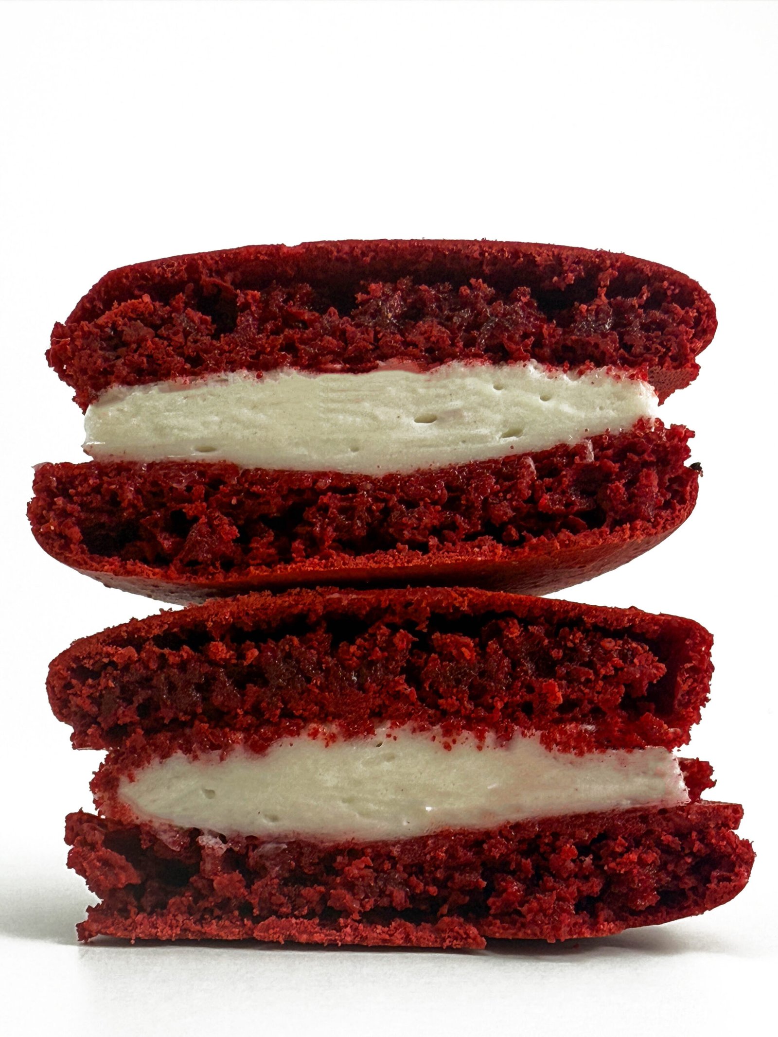 Velvety cocoa shells filled with smooth cream cheese buttercream create a balance of rich and tangy. Familiar yet luxurious, this Red Velvet macaron captures the elegance of its namesake cake in delicate form.