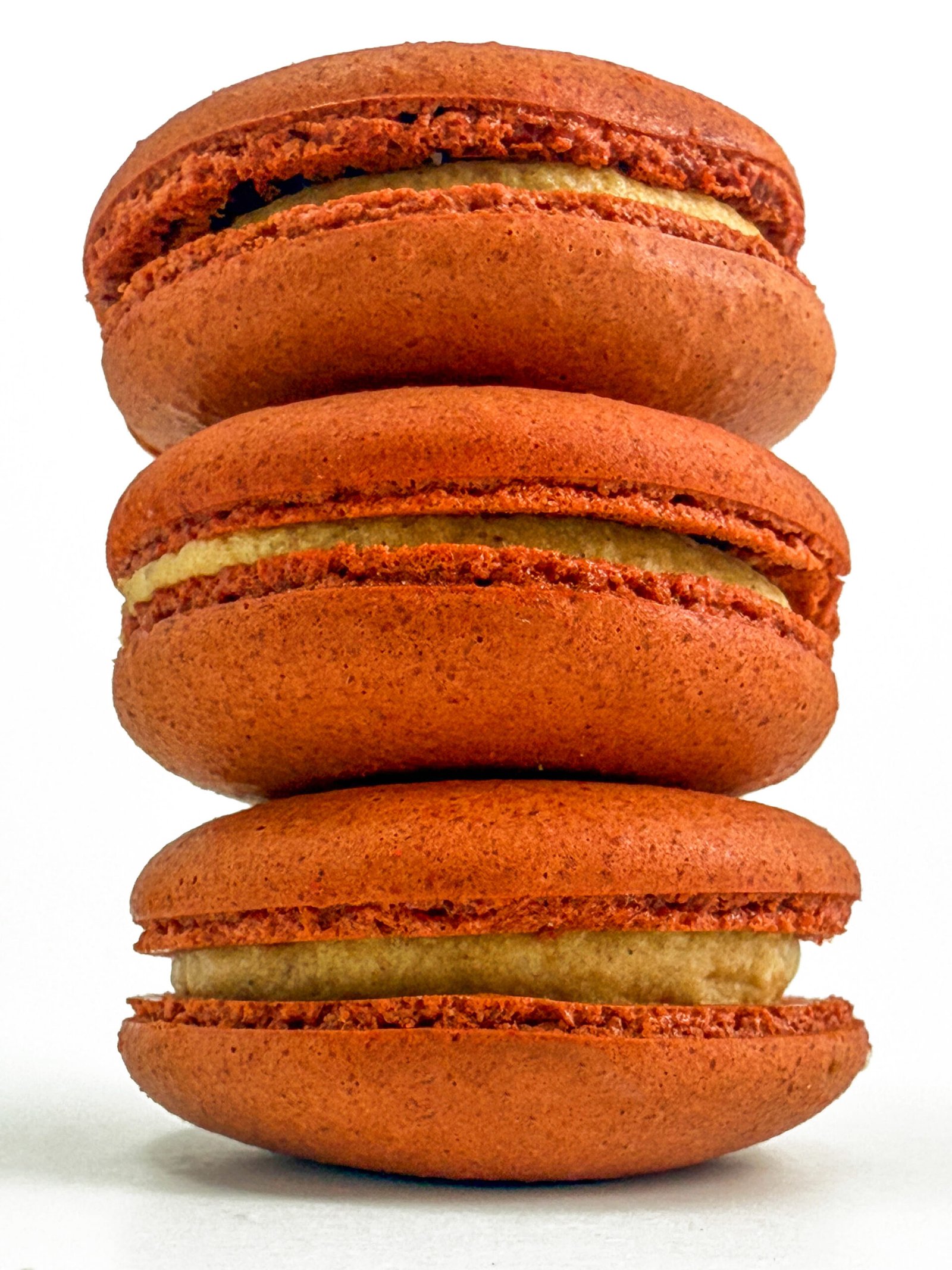 Pumpkin buttercream infused with cinnamon, nutmeg, and clove delivers all the cozy warmth of fall. Creamy, balanced, and seasonally irresistible—your favorite autumn latte, reimagined in macaron form.