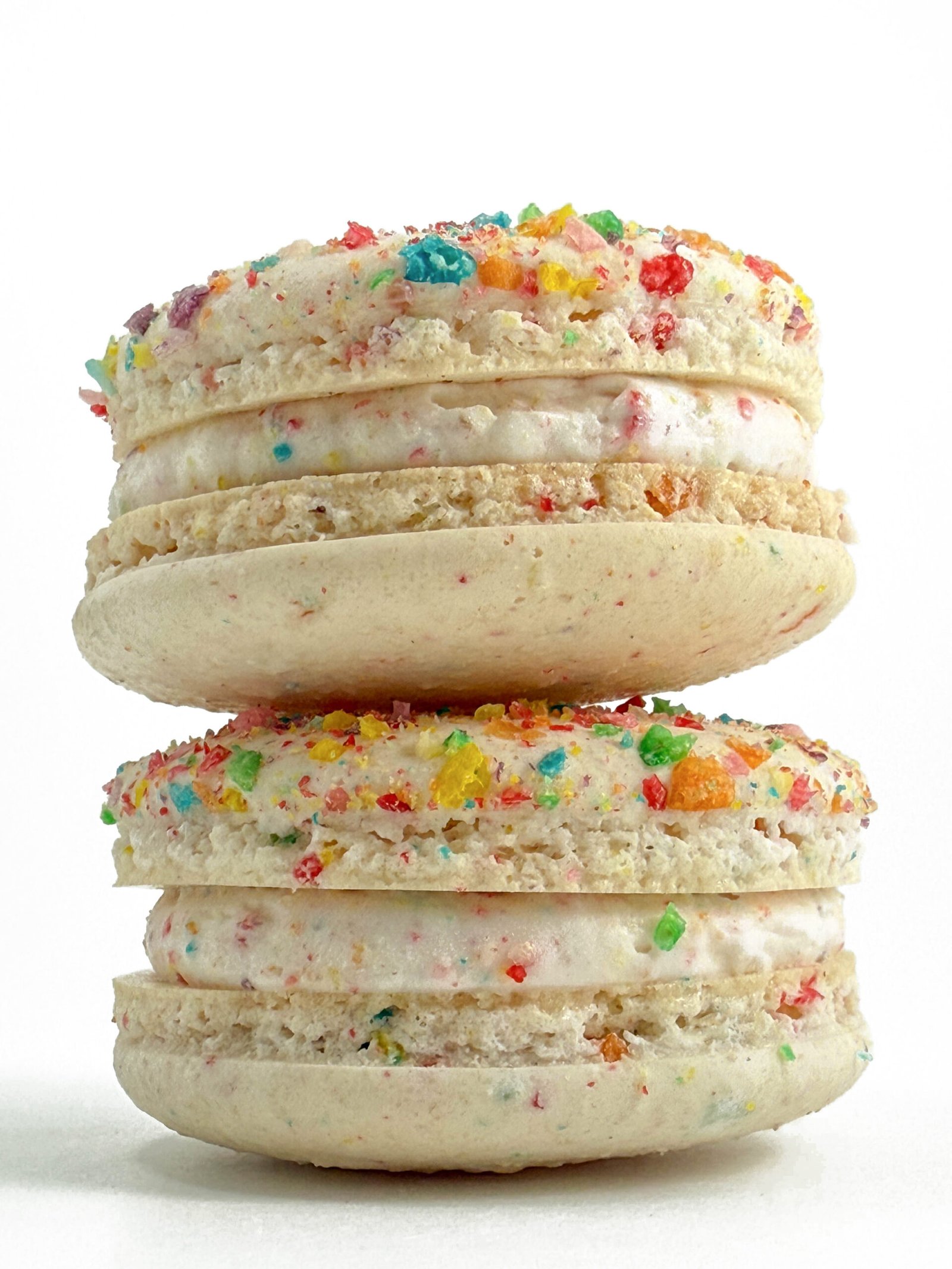 Vibrant vanilla buttercream blended with crushed Fruity Pebbles cereal brings a playful sweetness and nostalgic aroma to each bite. A macaron that feels like childhood—refined just enough for grown-ups.